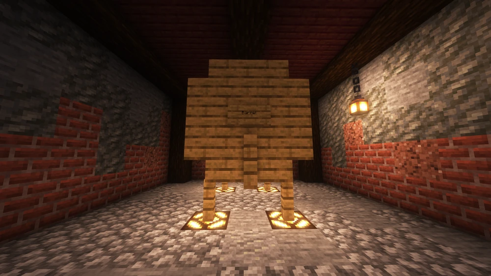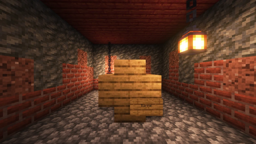 The final refinement of most advanced beverages takes place inside a barrel. Barrels made from different wood types influence the flavor and stability of the brew, and some drinks age best in oak, others in birch, jungle, dark oak or even the woods from the Nether. Aging requires time, and every recipe has a minimum and maximum threshold. Storing a brew for too short a time will result in immature flavor, while aging it for too long may weaken its quality or spoil the drink entirely. When aging is finished, players may take their creation directly from the barrel and enjoy the result of their work.